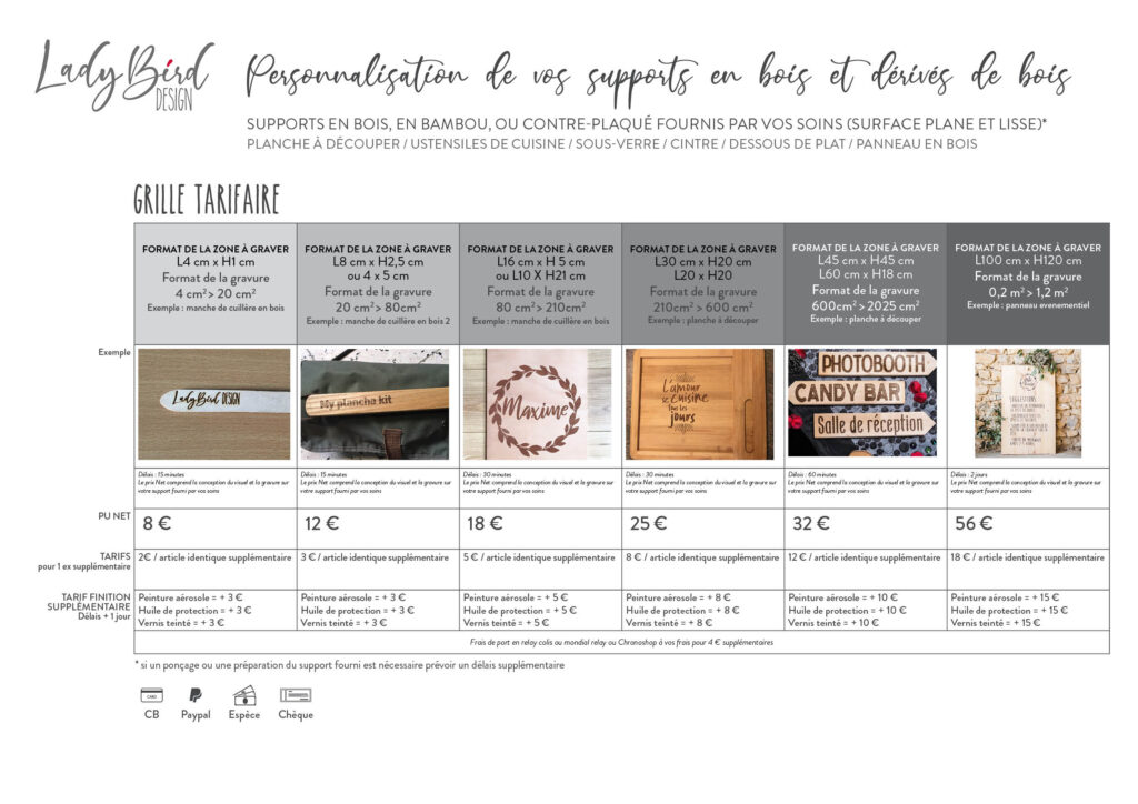 Confiez-moi vos supports en bois à personnaliser (planche à découper, ustensiles de cuisine en bois, un cintre en bois, une dessous de plat, sous-verre…) et je vous grave : un prénom, un surnom, une déclaration, une date…